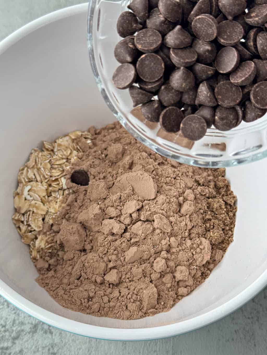 Then add the dark chocolate chips to the bowl. These are the dairy free dark chocolate cacao chips that I love: cacao chips. They are made of pure cacao, with no weird ingredients.