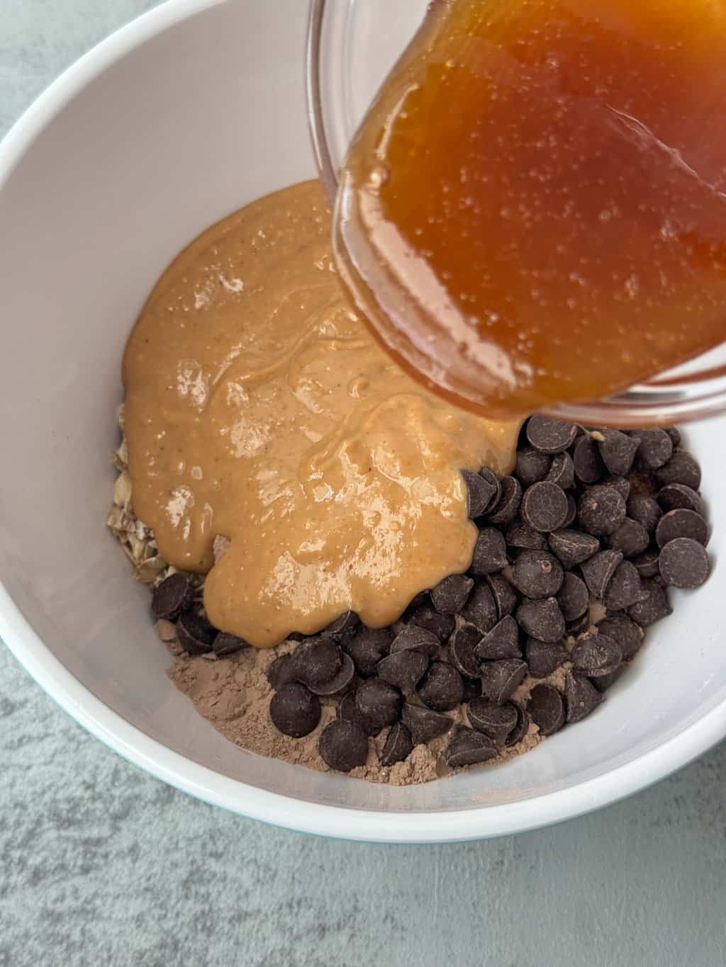 Add the creamy peanut butter, vanilla extract, and raw honey to the bowl.