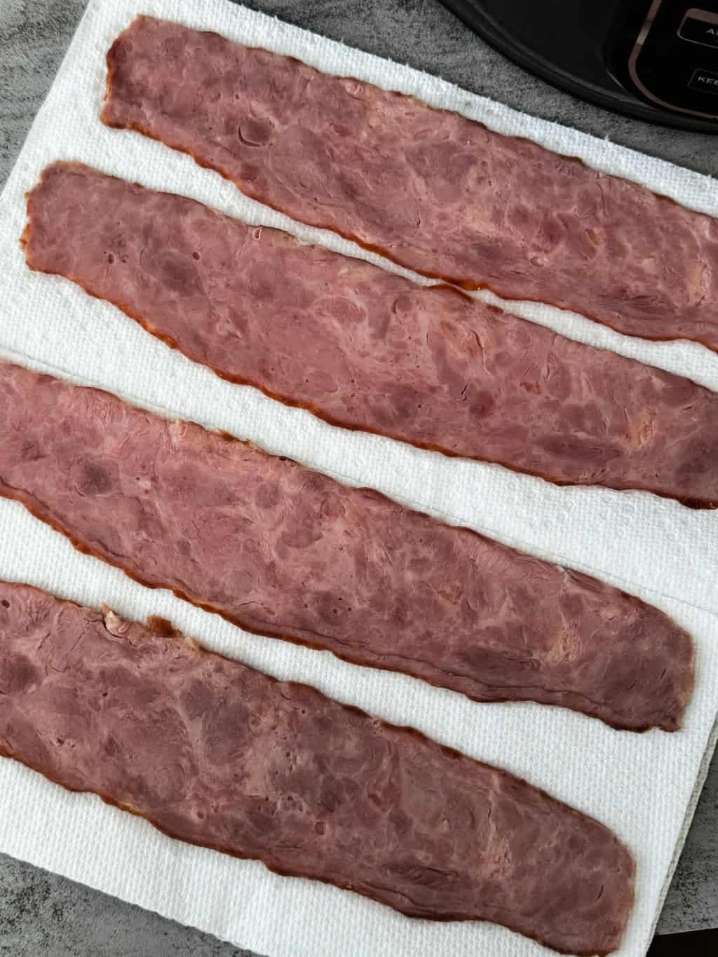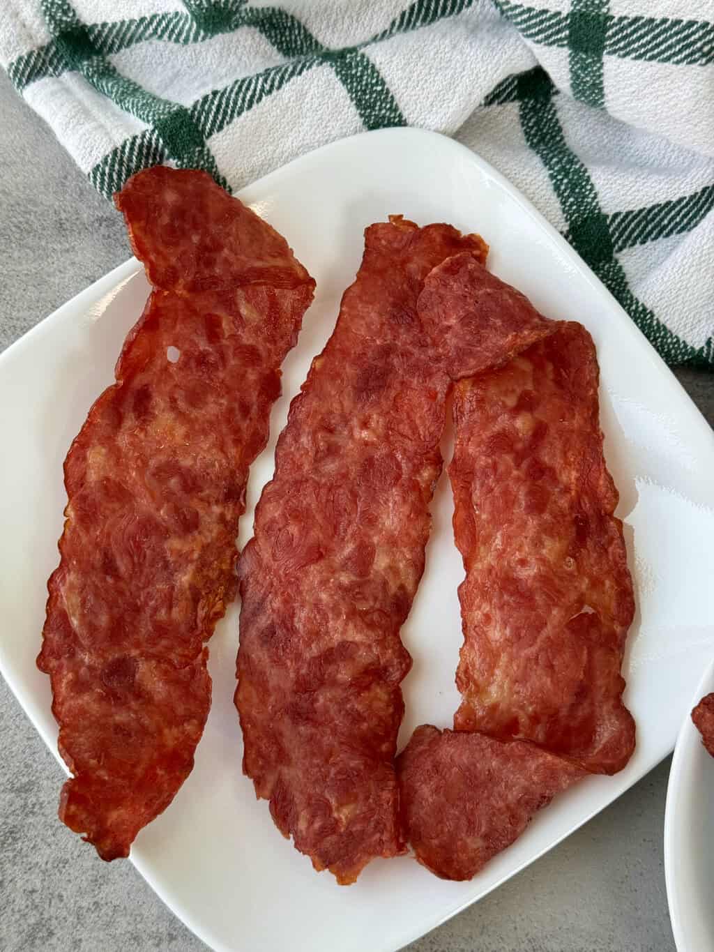 Remove the cooked turkey bacon from the air fryer basket and transfer it to a few pieces of paper towels to dab off any excess grease, which will be minimal if at all.