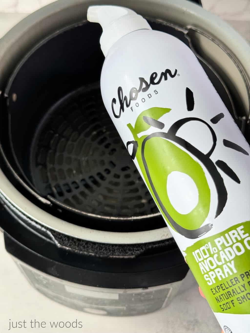 The Foodi should be all warmed up and ready. Use a little olive oil or avocado oil cooking spray and spray the air fryer basket to prevent sticking.