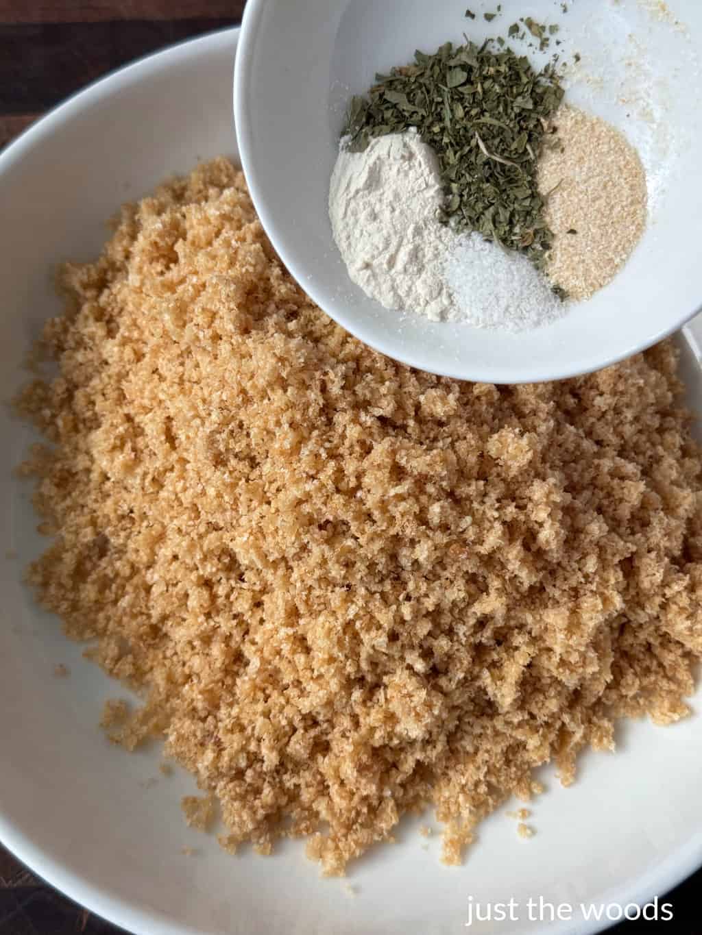 Next, put the pork panko breadcrumbs into a large shallow bowl and add the seasoning blend. This is the pork panko that I use and love. It is gluten-free and only contains one ingredient. You can find these bread crumbs online here: Panko.