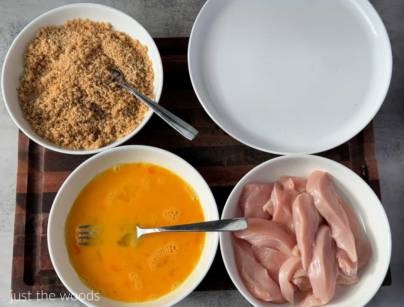 First, set up the separate shallow bowls with the naked chicken tenders, panko breadcrumb mixture, and beaten eggs. Also, grab a clean plate.