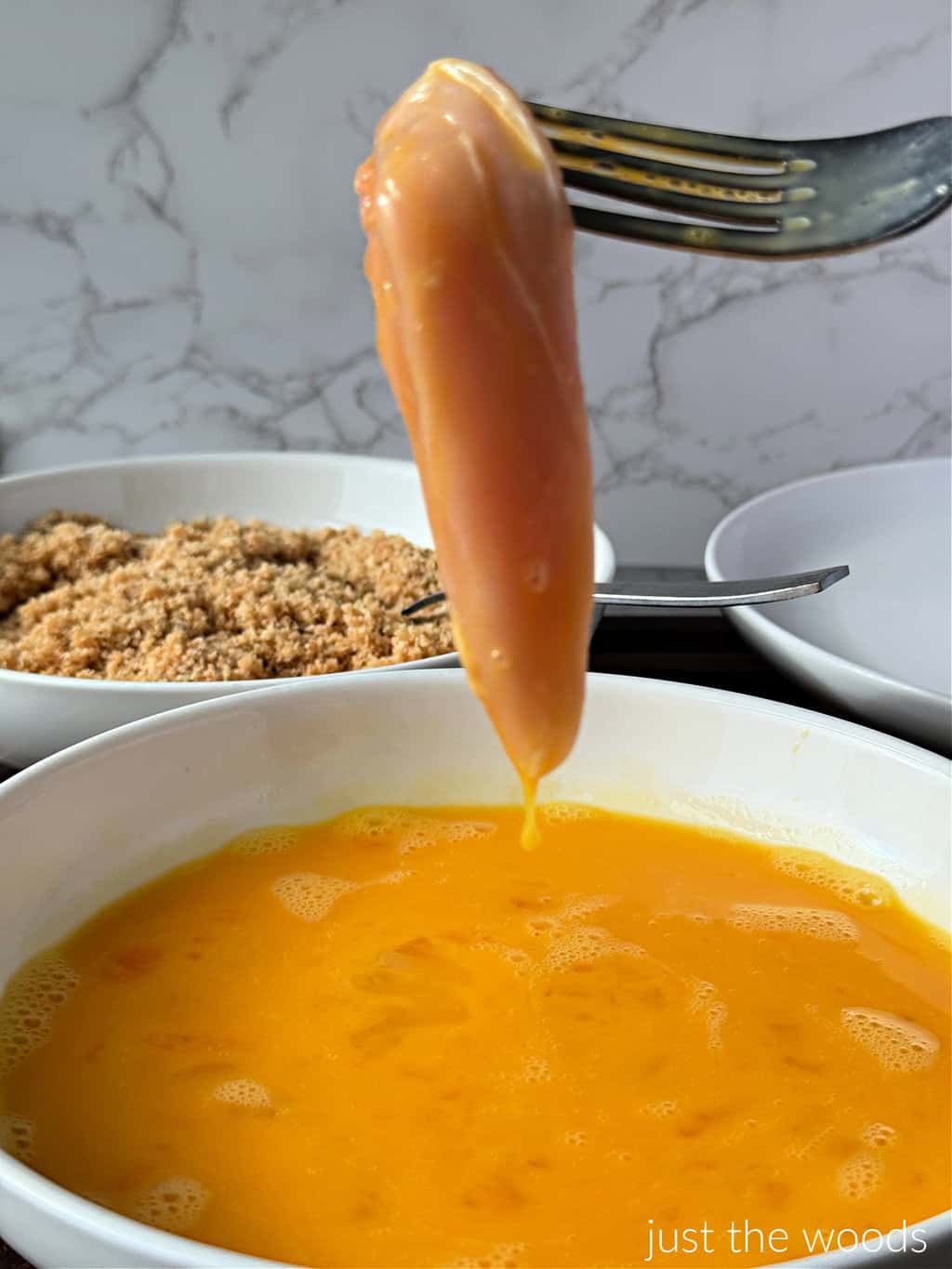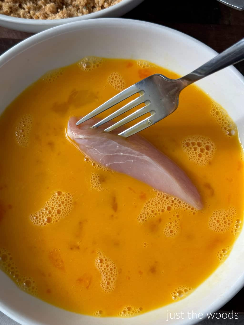 Make sure to move the chicken around to completely cover it with the egg.