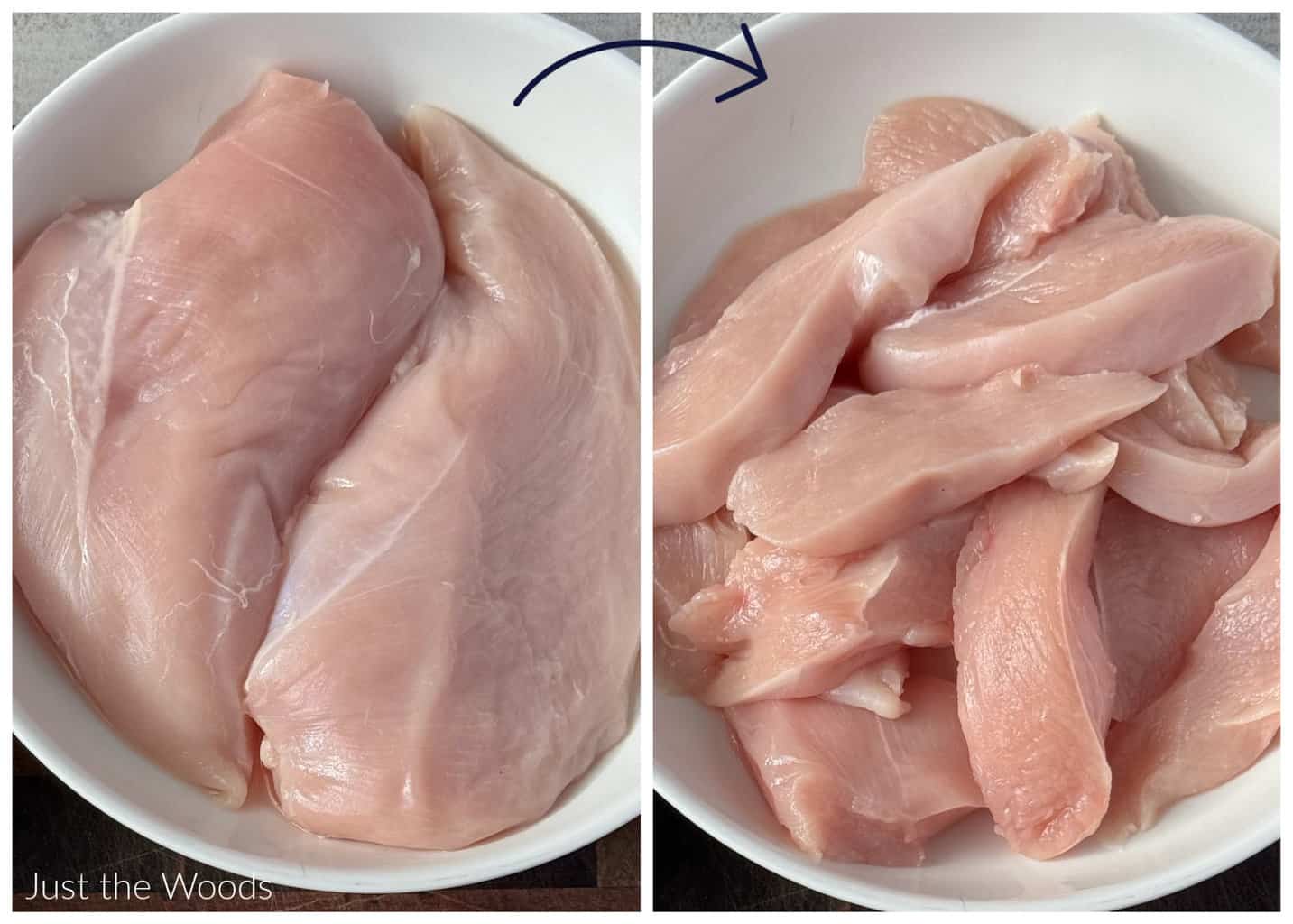 First, prepare the chicken. You can start with raw chicken tenders or chicken breasts. We are using boneless skinless chicken breasts and then trimming them into strips of chicken pieces.